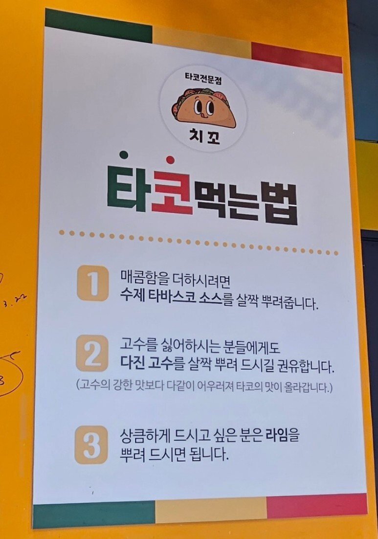 주문을 하고 기다리면서 벽에 붙어 있는 치꼬만의 타코 맛있게 먹는 법을 보며, 열심히 이미지 트레이닝을..타코방향 90도... 고개 기울기 51도...!!!!