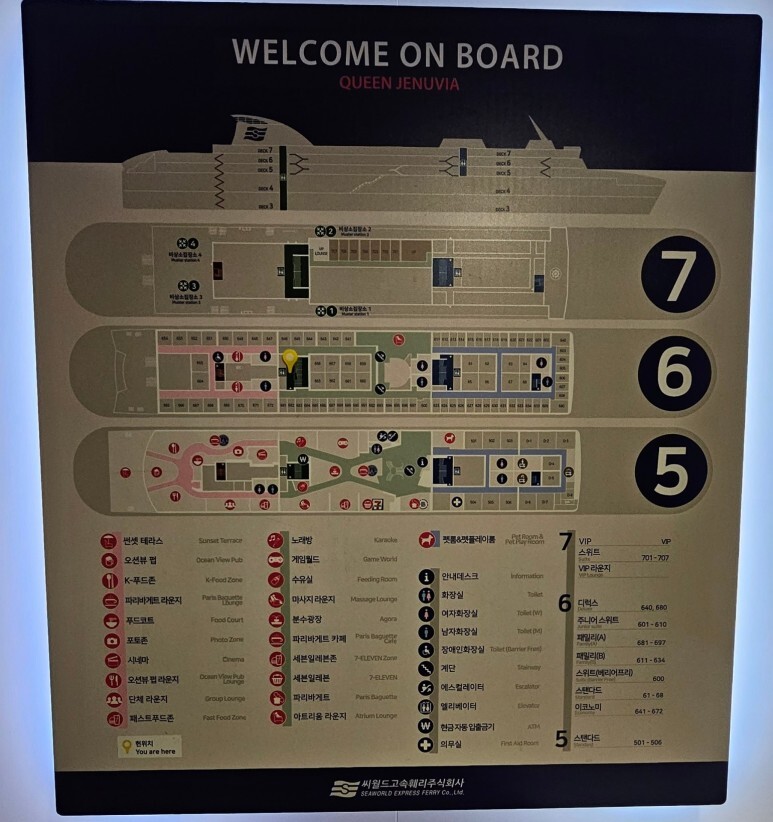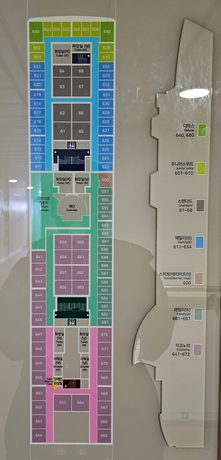 퀸제누비아호의 선체 길이가 170m가 되는 만큼 처음과 끝으로 객식이 쭈~욱 있으니 미리 안내도를 찍어 두시는게 좋을 것 같아요