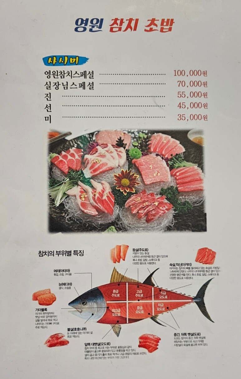 35,000원 부터 100,000원까지의 참치 코스 메뉴와, 식사류 등이 있고