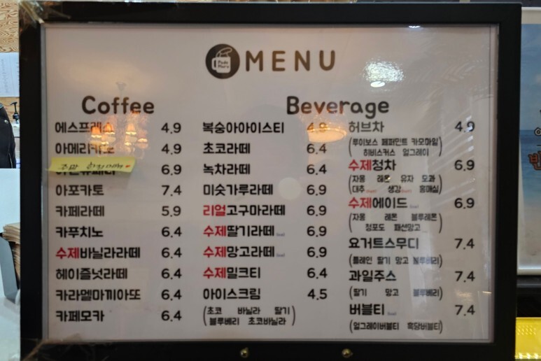 수제 메뉴(바닐라라떼, 딸기라떼, 망고라떼, 고구마라떼, 청차, 에이드 등)들이 좀 있었어요!!