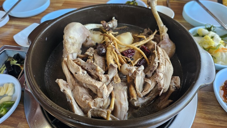 다양한 반찬들과 같이 저희가 시킨 토종닭백숙이 나왔는데요!