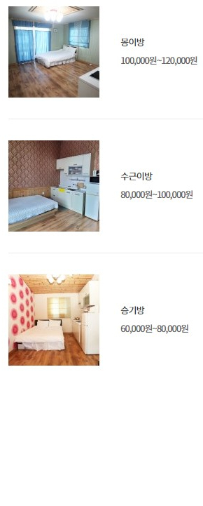 펜션 이름에서 보이듯이 초창기에 1박2일팀이 다녀가서 객실 이름들도 당시 1박2일 멤버들의 이름으로 정해져 있습니다.