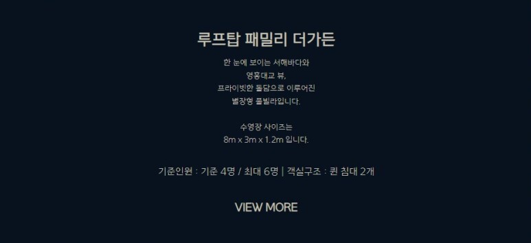 프레스티지 오션 더가든(4~7인), 그랜드 패밀리 더가든(4~6인), 그랜드 스위트 더가든(4~5인), 루프탑 패밀리 더가든(4~6인), 루프탑 로얄 더가든(4~5인), 로프트 오아시스 그린/브릭(2~4인), 스테이 미음/시옷(2~4인)