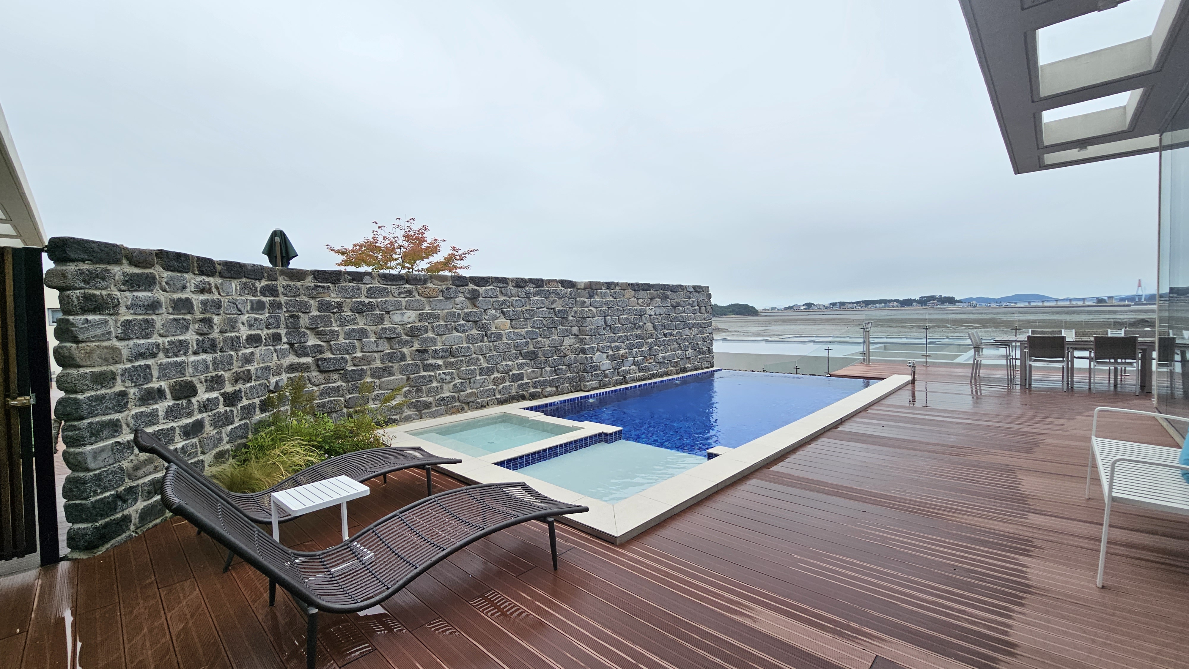 성인들이 놀기 딱 좋은 사이즈에 썬베드와 사이드테이블, 벤치의자도 있어 너무 좋았던!!