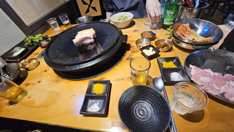 솥뚜껑의 경사를 통해 가운데로 고기 기름이 모이고 그 안에서 구워지는 김치와 버섯 파채, 미나리 등등 !
