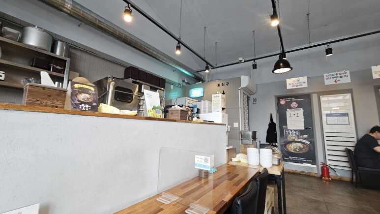 입구 왼편으로는 주방 그리고 주방에 붙은 1인용 바테이블, 오른편에는 테이블들이 있습니다.